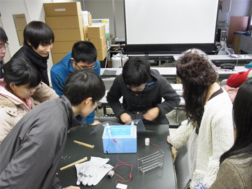 液体窒素による事故例を最初に紹介し,正しい利用方法でなければ大変危険であることを説明した。特に,低温,窒息,爆発などに関して実践的な説明を行った。次に岡山大学低温センターで,ヘリウム液化システムを見学し,その利用方法に関する説明を行った。ここでも,酸素濃度計の設置状況を題材にして,事故を起こさない仕組みなどを解説した。次に,液体窒素を使った実習を行った。最初に,液体窒素の汲み出し,運搬,低温容器への移し替えなどを体験した。その後,気体の液化や固化に関する実験,金属や半導体の電気抵抗温度変化に関する実験,超伝導体の観察などを行った。