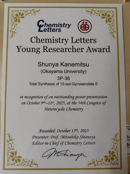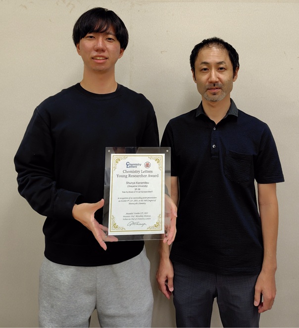 金光隼也さん(大学院博士前期課程2年)が第54回複素環化学討論会にて学生優秀発表賞(ポスター)を受賞しました。 発表題目:10-エピ-ギロサノライドEの全合成 金光さん(左)と髙村准教授